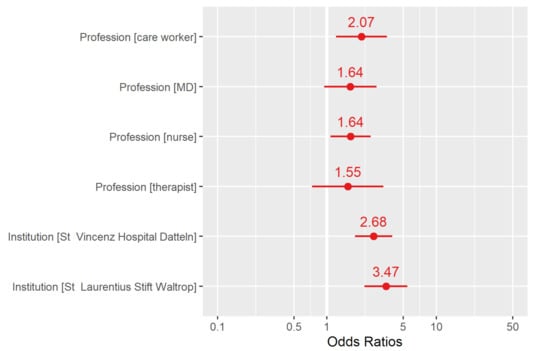 Risk of profession and institution for infection. To assess influence of number of contacts also inside hospitals, we conducted a bivari-able logistic regression with the two predictor variables institution (VHD, LSW, and VKJ) and profession. The latter was recoded regarding patient contact, specifying med-ical doctor, nurse, care worker, therapist, and all other professions without patient con-tact as “others”. To analyse if there were excess risk, the children’s hospital VKJ and “others” profession were chosen as reference. Results are displayed in a forest plot showing odds ratios.