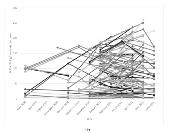 SARS-CoV-2 IgG antibody titer: signal to cut-off (s/co) index. (a) A total of 94 employees with exactly one positive blood sample. Each dot represents an employee who had exactly one positive antibody titer against SARS-CoV-2. (b) A total of 149 employees with more than one positive antibody titer against SARS-CoV-2. Each line represents one or more positive follow-up titers of one employee.