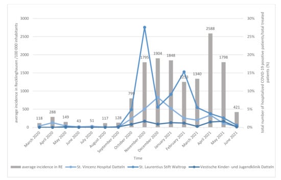 SARS-CoV-2 incidence in Recklinghausen (RE) and total number of hospitalized positive patients/total treated patients (%) from March 2020 to June 2021. Average incidence in Recklinghausen was provided by the interactive dashboard of the website: https://www.kreis-re.de (accessed on 25 December 2021).
