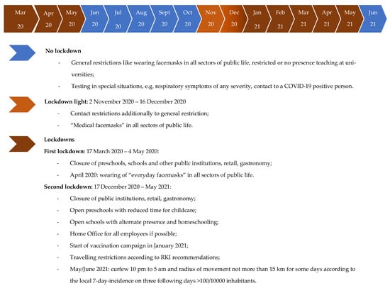 SARS-CoV-2 restriction measures in the county Recklinghausen followed the nationwide regulations (available online: https://www.bundesgesundheitsministerium.de/coronavirus/chronik-coronavirus.html (accessed on 30 January 2022).