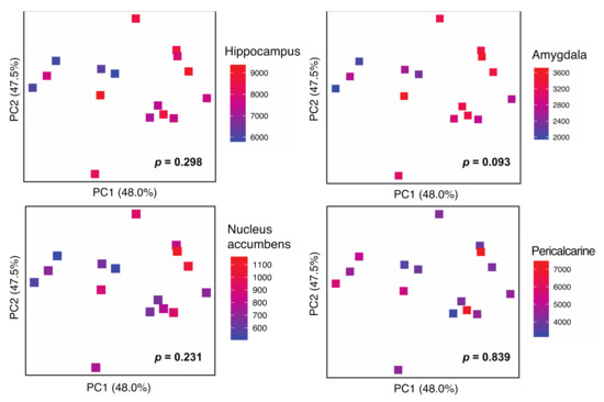 Beta diversity (community diversity between subjects) testing by robust Aitchison PCA revealed a graphical change in the association with amygdala volume, but did not reach statistical significance after adjusting for age and sex (Adonis p = 0.093; Figure 1). GMV in the hippocampus, nucleus accumbens and pericalcarine cortex (control) did not demonstrate associations with the microbiota beta diversity.