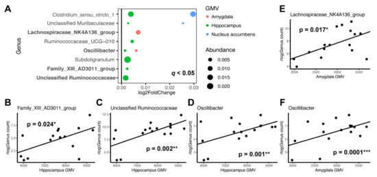 We performed differential abundance testing to identify the specific genera of gut microbiota that were associated with regional GMV in GD. After generating genus-level taxonomic summaries in QIIME, we conducted a multivariate DESeq2 analysis and controlled for age and sex. This revealed that seven individual genera were positively associated with hippocampal GMV, two with amygdala volume and two with nucleus accumbens volume at a false discovery rate of q < 0.05 (Figure 2A). Subsequently, we tested these genera individually with the corresponding regional GMV using a linear regression model with age and sex as covariates (Table S3). Out of the seven genera tested, genus Family_XIII_AD3011_group (β = 0.7, p = 0.024), an unclassified Ruminococcaceae (β = 0.856, p = 0.002), and genus Oscillibacter (β = 0.805, p = 0.001) demonstrated significant positive associations with hippocampal volume (Figure 2B–D). Genera Lachnospiraceae_NK4A136_group (β = 0.897, p = 0.017) and Oscillibacter (β = 1.055, p = 0.00008) were positively associated with amygdala volume (Figure 2E,F). However, the two genera initially identified by DESeq2 to be associated with nucleus accumbens volume did not show significant associations when tested individually.