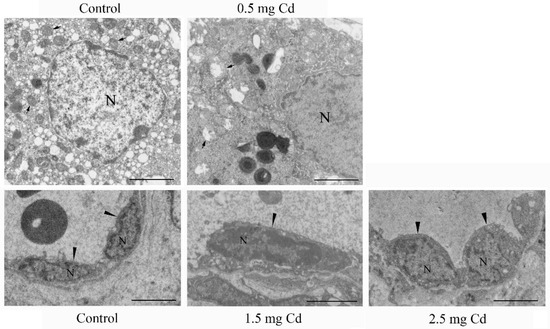 The ultrastructure of mouse testes treated with 0.5 mg/kg and 2.5 mg/kg CdCl2 for 10 days. Three mice were used in each group for analysis. N, nucleus; arrow, mitochondium; arrowhead, endothelial cells. Bar, 2 μm.
