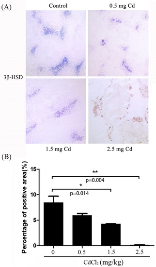 Leydig cells (LCs) are present in the interstitial compartment of the testis, and are responsible for the synthesis of androgens [46]. The steroidogenic enzyme 3beta-hydroxysteroid dehydrogenase (3β-HSD) is a marker for the steroidogenesis of Leydig cells [47]. The damage caused by cadmium to Leydig cells has been reported in several studies [8,48,49]. In our study, significantly weaker staining of 3β-HSD activity was detected in the high-dose (2.5 mg/kg) group, but both the 0.5 and 1.5 mg/kg CdCl2 treatments also exhibited inhibitory effects on 3β-HSD activity. In addition, previous studies have shown that 3β-HSD activity or expression is downregulated by Cd treatment [47,50]. Treatment with Cd also causes a significant decrease in serum testosterone levels [51]. A previous study indicated that testosterone levels are significantly impaired in animals exposed to 0.86 and 1.1 mg Cd/kg, although the density and morphology of Leydig cells are unchanged [52]. In our study, the activity of 3β-HSD is also significantly decreased by high dose of cadmium.
