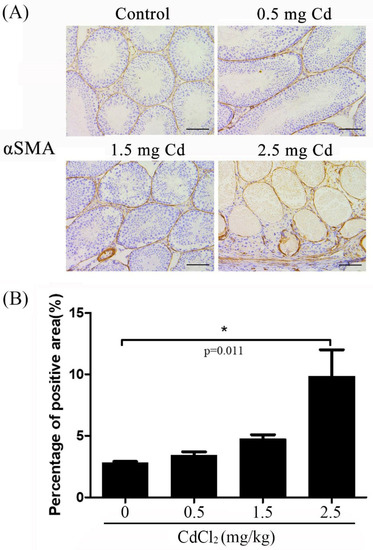 It has been demonstrated that αSMA is a marker for peritubular myoid cells and myocytes of the blood vessels in the testes [30]. Both peritubular myoid cells and myocytes of the blood vessels are similar to smooth muscle cells [31]. In the control group, weak αSMA immunostaining could be observed in the blood vessels and peritubular cells (2.73 ± 0.08), which gradually became stronger. Furthermore, strong αSMA staining could be observed in the peritubular myoid cells, myocytes, and smooth muscle cells of the testis in the 2.5 mg/kg group (9.16 ± 1.41) (Figure 3). Western blot also showed an increasing trend for αSMA protein levels when the dose of cadmium increased from 0.5 mg/kg to 2.5 mg/kg (Figure 4).