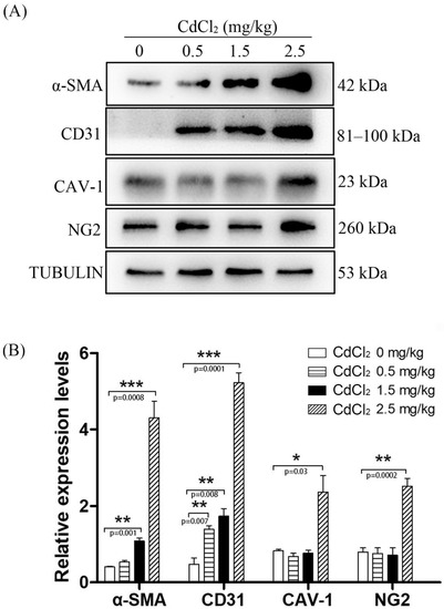 In our study, we found a significant increase in vascular vessel-related molecules (CD31, NG2, αSMA and caveolin-1) after the mice were treated with a high dose of CdCl2/kg. In comparison with the control, the height of testicular endothelial cells was significantly increased and enlarged in the blood vessels. Even in the low-dosage groups, there was also a slight increase in the protein levels of CD31, NG2, αSMA and caveolin-1. The effects of Cd treatment on αSMA expression and the proliferation of myofibroblasts were also reported in the lung and kidney [40,41,42]. Elevated levels of α-SMA are observed in chronic obstructive pulmonary disease (COPD) patients with higher circulatory Cd [43]. Although there are no reports regarding the capillarization of Cd, arsenic treatment promotes the capillarization of the sinusoidal endothelium in the liver [39]. Both epidemiological studies and animal studies have shown that Cd exposure is related to atherosclerosis, hypertension, and endothelial damage, which are responsible for cardiovascular diseases [39,44]. Cd exposure induces hypertension and impairs vascular responses to phenylephrine, acetylcholine, and sodium nitroprusside [45]. It is possible that Cd-induced proliferation of vessel endothelial cells or mural cells may cause hypertension.