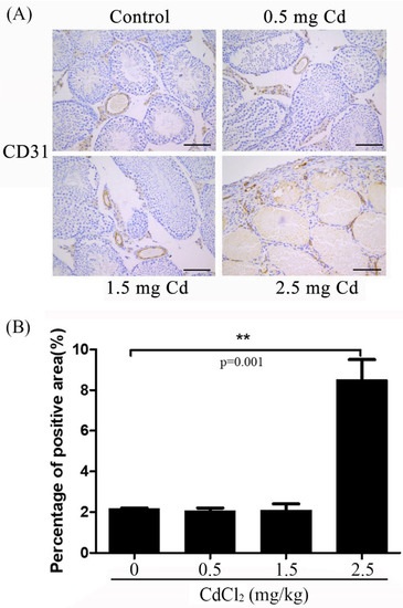 Recent studies have shown that the testis is extremely sensitive to cadmium toxicity, due to the high expression of ZIP8 in the endothelial cells of the testis. ZIP8 is mainly involved in the transport of zinc, manganese, and cadmium from the extracellular space [12,19]. Although cadmium can cause various forms of damage to the testis [3,8,20], recent data have shown that it primarily targets the vascular endothelium in the testis [21]. However, the mechanism underlying how cadmium affects the vascular system of the testis remains to be defined. The aim of this study was to examine the effect of cadmium exposure on mouse testis through multiple approaches. In this study, male mice were administered different doses of cadmium daily for 10 days. The blood- vessel-associated proteins significantly increased with a high dose of cadmium, suggesting that the proliferation of mural cells or endothelial cells was stimulated.