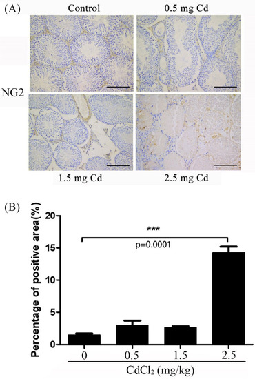 NG2, a chondroitin sulfate proteoglycan, is a marker for the pericytes of blood vessels [30,35]. Compared with the control (1.50 ± 0.11), a similar weak NG2 staining signal was detected in the interstitial compartment in the 0.5 and 1.5 mg/kg groups (2.83 ± 0.44 and 2.66 ± 0.08). The NG2 staining signal became stronger in the testicular tubules and interstitial space (Figure 7). Immunostaining and Western blot also showed that NG2 levels were significantly increased in the 2.5 mg/kg group compared with the other groups (14.30 ± 0.51 for immunostaining) (Figure 4).