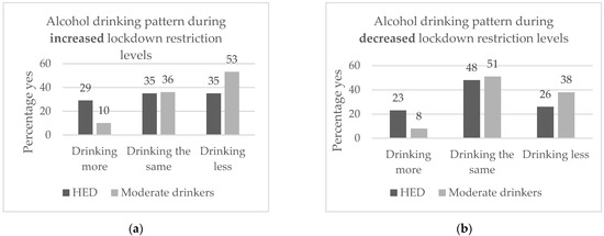Alcohol drinking patterns of HED and moderate drinkers during (a) increased lockdown restriction levels (p < 0.001, Chi-square) and (b) decreased lockdown restriction levels (p < 0.001, Chi-square).