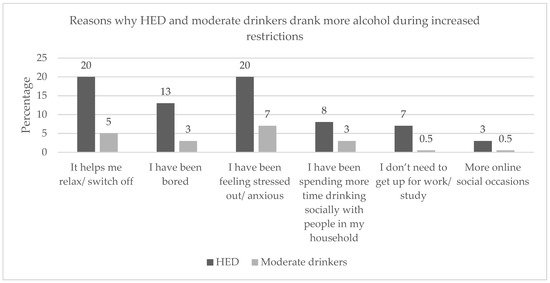 Reasons why HED and moderate drinkers reported drinking more alcohol during increased restrictions (all showed significant differences between HED and moderate drinkers; p < 0.05).