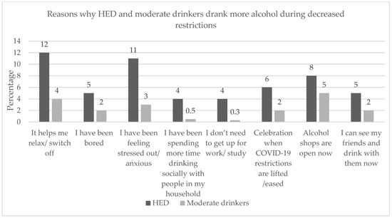 Reasons given for consuming more alcohol as the restrictions increased and decreased that were significantly more frequent for the HED group than for the moderate drinking group were, in descending order, feeling stressed, helping them to relax, feeling bored, having more time to consume alcohol with their household, and not needing to wake up for work/study (Figure 2 and Figure 3). Having more online social occasions was found to have a significantly higher frequency as the restrictions increased for HED only (Figure 2). Celebrating the lifting of restrictions and being able to see and drink with their friends was found to have a significantly higher frequency as the restrictions decreased for HED only (Figure 3).