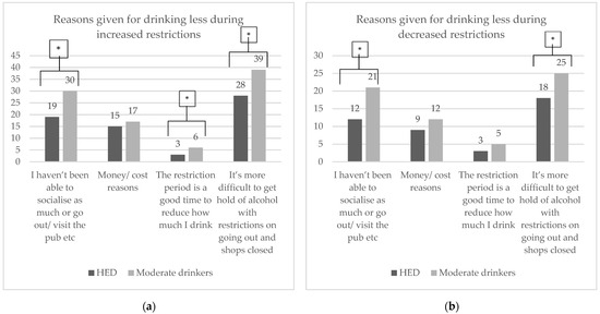Reasons why HED and moderate drinkers reported drinking less alcohol during (a) increased lockdown restrictions and (b) decreased lockdown restrictions shown as percentages (values marked with an * are significantly different, p < 0.05).