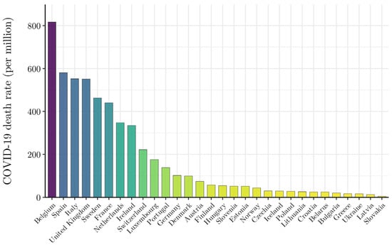 At the end of spring (31 May), the COVID-19 death rate (deaths over population) was strikingly unevenly distributed across Europe (Figure 1). Among the hardest hit countries in the first wave of the pandemic were Belgium, Spain, Italy, and the United Kingdom with COVID-19 death rates of 816, 580, 553, and 552 deaths per 1 million, respectively. As of 31 May 2020, the United Kingdom’s COVID-19 death rate exceeded the similarly developed economy of Germany (102 per million) by more than a factor of 5. Few epidemiological indicators distinguish the countries of Europe by such an extent.