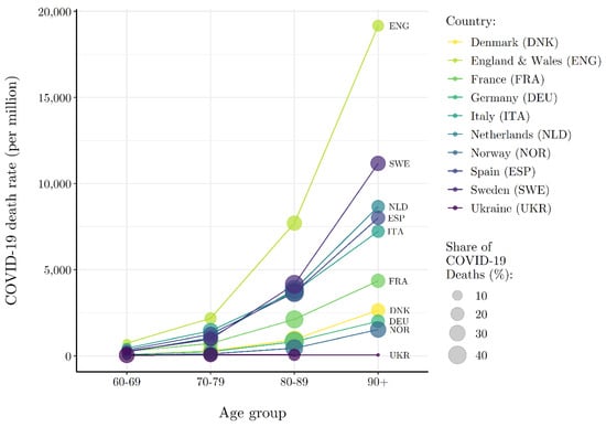 Because the risk of COVID-19 death is significantly higher among the elderly, one might assume that variation in the COVID-19 death rate across Europe in this period reflects differences in age structure [1,2]. Consider Figure 2 that plots age-specific COVID-19 death rates (as of 31 May 2020) for nine European countries with readily available data. The size of each point plotted in Figure 2 reflects the share of total reported COVID-19 deaths that can be attributed to each age group within a country. Most striking is that the cross-national variation observed in Figure 1 remains. England’s age-specific death rates are roughly five times that of Germany’s across all age groups. The within-age-group variation in COVID-19 death rates across countries implies that the age structure of the population cannot account for observed differences in COVID-19 mortality risk between European countries. In fact, the percentage of the population ≥ 65 (r = 0.134, p = 0.480) and ≥75 (r = 0.186, p = 0.325) years of age is statistically uncorrelated with the COVID-19 death rate during this phase of the pandemic.