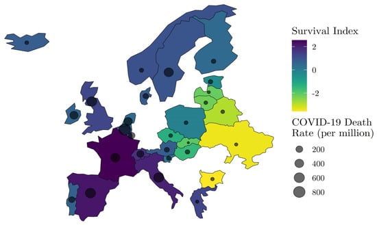 Spatial distribution of Wave I (ending 31 May 2020) COVID-19 mortality risk and relative survival environment. NOTE: COVID-19 death data by country are from Johns Hopkins Coronavirus Resource Center (JHU CSSE) (https://github.com/CSSEGISandData/COVID-19 Unified-Dataset (accessed on 15 June 2020)), and Survival Index data are derived from the Human Mortality Database (HMD) (https://www.mortality.org/ (accessed on 15 June 2020)).