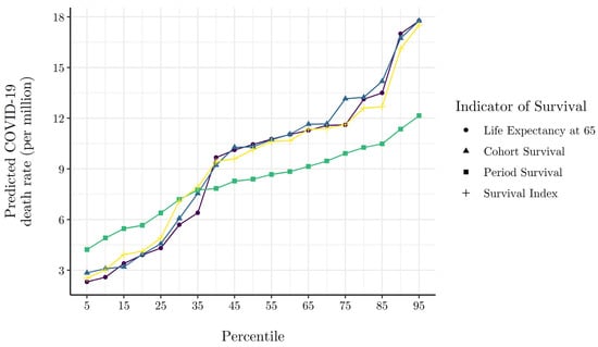 Figure 4 shows predicted COVID-19 death rates from Equation (12) across percentile scores of all indicators of the pre-existing elderly survival environment. We derive predicted COVID-19 death rates by fixing other model covariates pertaining to inbound international travelers, healthcare system capacity, the stringency of non-pharmaceutical interventions (NPI), population density, percent elderly, the confirmed case rate, and week of observation, set at their sample means. We observe high statistical agreement across indicators of the elderly survival environment. Results indicate that the expected COVID-19 death rate is 2.4× higher for countries at the 75th percentile of our survival index as compared to countries at the 25th percentile. Overall, Figure 4 implies that the rate of COVID-19 mortality increased linearly in pre-existing elderly survival over the first wave of the COVID-19 pandemic in Europe.