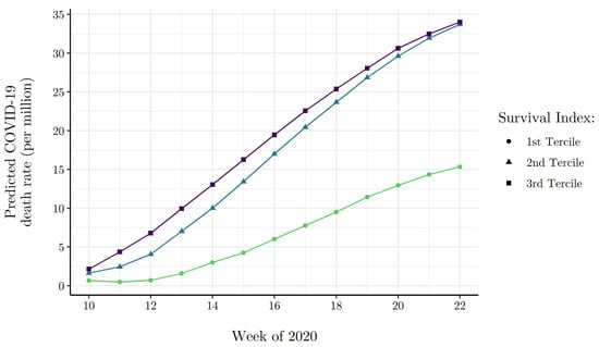 Next, Figure 5 presents results from Equation (14), showing predicted cumulative COVID-19 death rates by Survival Index terciles over the course of the first wave of the European pandemic. Again, predictions are derived with all other model covariates fixed at their sample means. The results in Figure 5 corroborate the hypothesis that the pre-existing survival environment is positively associated with the COVID-19 death rate. By the 22nd week of the pandemic, the predicted COVID-19 death rate of high elderly survival countries stood at 34 deaths per million, about 2.2× higher than low survival environment countries.