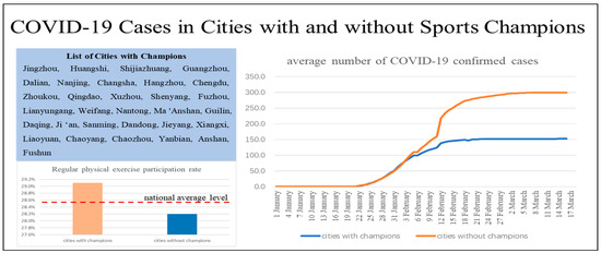 Is there a correlation between the number of sports champions and the COVID-19 confirmed cases in a region? This is indeed an interesting question, and it seems that we can observe some evidence for it. Starting with a set of data in China, we counted the number of Chinese athletes who won gold medals at the 2016 Spring Olympics in Rio de Janeiro of prefecture-level cities according to the birthplace of the athletes, and it is obvious that there are fewer COVID-19 cases in regions with champions than those without champions (Figure 1). Moreover, it is revealed that except for Jingzhou and Huangshi, two cities in Hubei, the province with the first and worst outbreak in China, the number of confirmed COVID-19 cases in most champion cities is relatively small, even in provincial capitals with large and mobile populations, such as Fuzhou, Shenyang, Chengdu, Hangzhou, Changsha, Nanjing, and Guangzhou. At the same time, it can be observed that the share of the population that regularly participates in physical activity in champion cities is also higher than the national average and non-champion cities. Does it imply that there is indeed an association between the number of sports champions and the COVID-9 cases? If there is an association, what is the influencing mechanism? Athletic competition winners are often heroes in the eyes of people, especially young people, and are role models for them to learn from and imitate, so did these sports heroes who brought glory to the nation also make a great contribution to the epidemic prevention and control through some pathway?