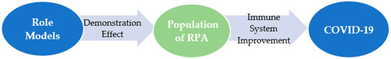 In the theoretical framework, it is the number of regular physical activity (RPA) participants that links the demonstration effect of sports champions to the immune function improvement effect of physical activity. As mentioned above, the number of regular physical activity participants is influenced by the demonstration effect of sports champions, in which the demonstration effect of sports role models motivates the people to actively participate in physical activity. Then, the number of regular physical activity participants influences the number of COVID-19 infections, because the more people who participate in physical activity regularly, the more people who improve their immune function, the fewer people who are at risk of COVID-19 infection. The theoretical framework of this study is shown in Figure 2.
