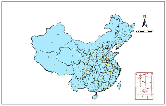 Our study includes 279 prefecture-level administrative regions in China, covering all provinces in mainland China, and the vast majority of prefectural cities are in our sample (see Figure 3). The missing ones are mainly autonomous cities dominated by ethnic minorities in Tibet, Xinjiang, Inner Mongolia, and southwest China, which are excluded due to the high number of missing data and are not usable and representative. Our selected 279 urban cities cover more than 98% of China’s total population and more than 99% of GDP, and the sample is representative and widely used in studies of China [64,65,66].