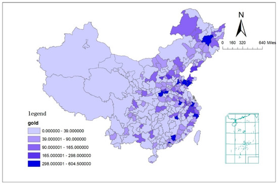 To capture the demonstration effect of sports champions, this paper selects the number of gold medals won in provincial-level and above sports events of each city in 2019 as a proxy variable for the explanatory variable. In this paper, provincial-level and above sporting events include international and intercontinental competitions (Olympic Games, Asian Games, World Championships, etc.), national competitions (National Games, National Winter Games, etc.), and provincial competitions (sporting events held by each province itself). When there is a case of sharing a gold medal with another province or city, this championship award is counted as 0.5 gold medals. The distribution of number of gold medals is shown in Figure 4. It can be seen that the cities with more gold medals are Qingdao, Jinan, Suzhou, Harbin and Hefei, with the numbers of 604.5, 565, 489, 445 and 392, respectively.