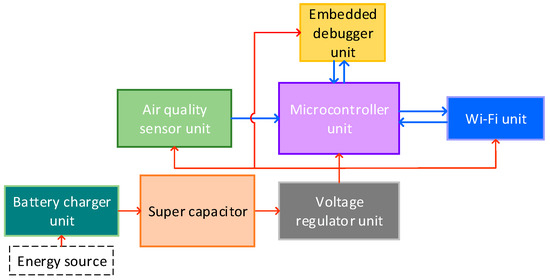 This study developed a smart, autonomous, wireless sensor node to be applied in monitoring indoor air quality. The proposed device comprises four major units including the energy storage, sensor, processor, and wireless transceiver as shown in the functional block diagram presented in Figure 1. The entire units of the proposed device are designed to be powered by rechargeable energy storage in line with the plan for future autonomous devices coupled with an energy harvesting system. The processor used is a microcontroller-based AVR and supports low power mode. Moreover, the system is equipped with a Wi-Fi module that connects it to the internet for data transmission purposes. The power source is a supercapacitor while the external power supply is designed to be used during the charging process and released during the discharging process for the supercapacitor to function. However, the system is expected to be linked to indoor energy harvesting as a power source in the future.