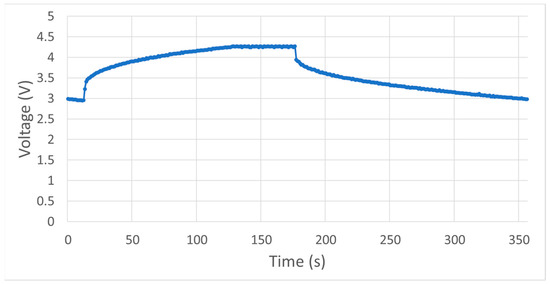 The supercapacitor was tested by measuring its voltage during the charging and discharging process using Arduino Uno analog input. The charging process was conducted by connecting the system developed with an external power supply, and an Arduino Uno was programmed to monitor the supercapacitor voltage. The time required for this process from a voltage of 3.2–4.2 V was 85 s. Meanwhile, the discharging process involved using the supercapacitor to power the VOCs sensor node and the time required to drive the minimum voltage for the system at 3.2V was 139 s, as indicated in Figure 3. The supercapacitor charging capacity was found to be 2.7 mAh using Equation (3) and the data tested.