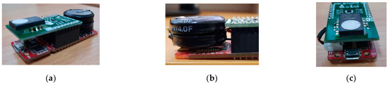 VOCs sensor node prototype: (a) side view, (b) energy source (supercapacitor), and (c) front view.