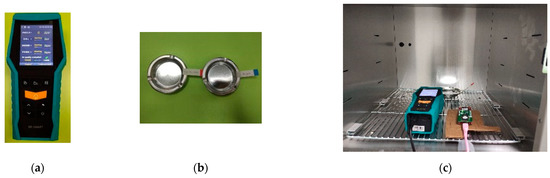 VOCs validation: (a) VOCs measurement instrument, (b) test object, and (c) test configuration.