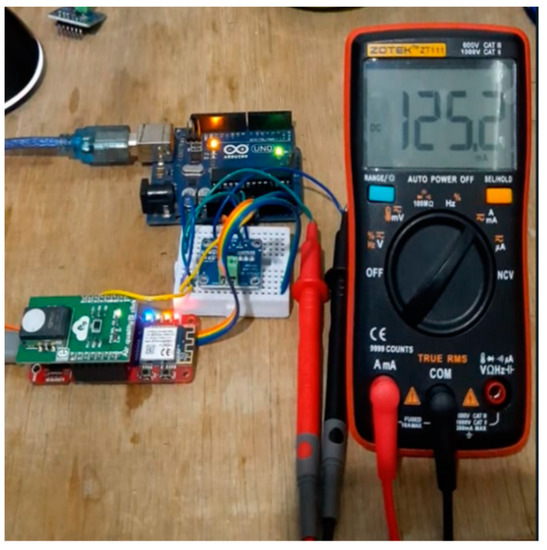 The 1NA219 sensor was used to measure the current and voltage of the VOCs sensor node as well as the power value. This involved measuring the voltage across 0.1 Ω, 1% sense resistor, and 0.1 mA resolution with maximal current at ±400 mA when the internal gain was set at div8. Moreover, I2C was used as the interface to communicate with the processor while Arduino Uno was applied to read the INA219 sensor data output, as shown in Figure 9, to avoid interfering with the measurement of the power on the load.