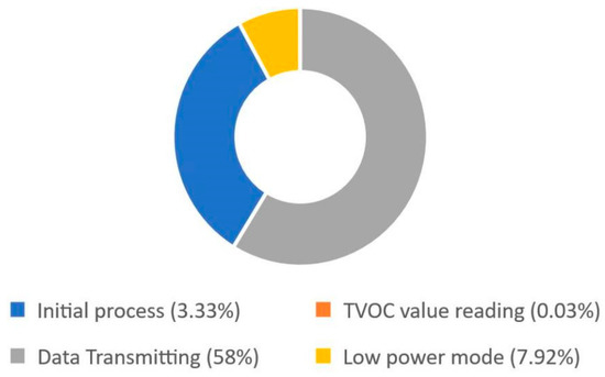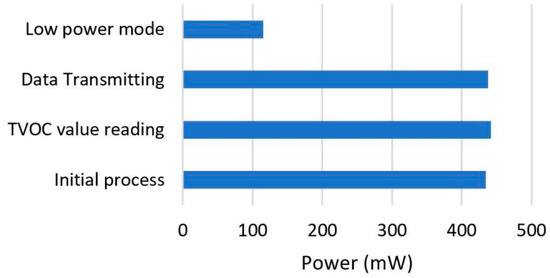 The power on the VOCs sensor nodes was measured based on the algorithms described in the Software subsection. The system has four processes in one cycle interval, which include the initial process, reading of TVOCs values, the transmission of data, and low power mode. The initial process is the first step the system takes when it is turned on and all the components including the Mainboard, sensors, and Wi-Fi are initiated. This stage is usually conducted once as long as the system is running and reinitiated when the system restarts. Moreover, the TVOCs value reading stage involves the measurement of the TVOCs pollutants through the IAQM sensor to produce calibrated TVOCs and CO2 equivalent values [31] that are sent through the server during the data transmitting stage. The successful completion of the data transmission is normally followed by the activation of the low power mode for 30 min by the system, after which the mode is disabled and the TVOCs value reading stage is repeated for the subsequent data. Figure 10 shows that the highest power consumed was approximately 441.83 mW from the TVOCs value reading stage. The value reduced drastically to 114.16 mW when the low power mode was enabled, and this means the mode is important in autonomous indoor TVOCs monitoring. It is also important to note that the data transmission interval is the key to the lifetime of a system working with a specific energy storage capacity. The system was designed to work on low power mode when no data are being transmitted to reduce the power consumption rate.