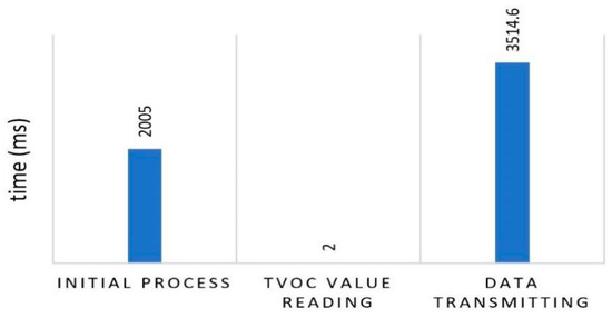 The processing time was evaluated in each process as observed with the power measurement. The time interval was set at 30 min considering the changes in the relatively fixed values and the fact that there was no need for quick monitoring. Figure 11 shows that the time required for the initial process was approximately 2005 ms with most observed to be for the wireless initialization. The TVOCs value reading process required 2 ms, while the transmission of the two outputs data including CO2 and TVOCs values to the server required approximately 3514.6 ms. It is important to note that these are the average values from the five processing rounds conducted.