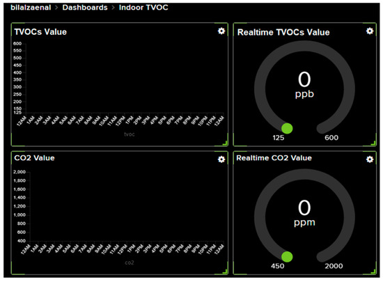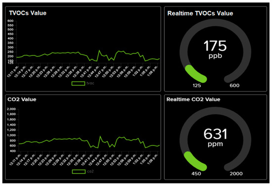 Figure 15 shows the TVOCs and CO2 readings on the dashboard in the university laboratory with the TVOCs real-time value recorded to be 175 ppb, which means it is at a concentration level 2 as shown in Table 1, thereby indicating that the air quality is good.