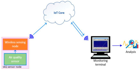 Organizations such as the WHO [11], US EPA [12], and German Federal Environmental Agency [13] have issued some indoor air quality (IAQ) standards [14] to ensure continuous monitoring of indoor air pollution from all directions. Several studies focused on the optimal use of the sensor [15] in monitoring indoor air quality, while others compared its processor usage [16] and algorithm development [17,18]. In Ref. [19], particles such as carbon dioxide (CO2), temperature, humidity, PM2.5, and VOCs were considered in IAQ monitoring with their variations observed to have been monitored successfully through the system developed, which was designed for flexible implementation and to support low-cost sensors. Another study [20] also monitored CO2, NO2, HCHO, and TVOCs successfully using an ARM microcontroller-based LPC2478 equipped with automatic control of the heat exchange ventilator. The “poor” status in the monitoring system was designed to automatically trigger the heat-exchange ventilation operation and this was reported to have a better performance compared to another ventilation method, specifically the traditional natural method. Moreover, the authors of Ref. [21] developed a wireless gas sensor network for pollutant detection and explained the evolution of the prototype up to the fourth version, which is equipped with a solar panel. The sensor nodes were also powered by a Li-ion battery with a solar panel for outdoor application. The review conducted by [22] on the study of air quality monitoring between 2015 and 2020 discovered that Arduino, Raspberry, and ESP8266 modules were usually used as the main processing units. Several studies also considered using Bluetooth and the ZigBee platform instead of Wi-Fi as the communication protocol due to their power efficiency.