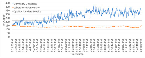 The sensor was tested at two different locations as described in Table 8 and observed to be working effectively. Figure 16 shows the IAQ sensor value for 400 min and the laboratory was discovered to have an average TVOCs value below the quality standard of level 2 (<222 ppb), while the dormitory was above the quality standard as defined in Table 1.