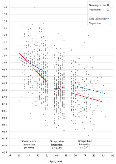 A scatter plot of the effect of the interaction between time and diet on left femoral neck bone mineral density in the three age groups of vegetarian and non-vegetarian women.