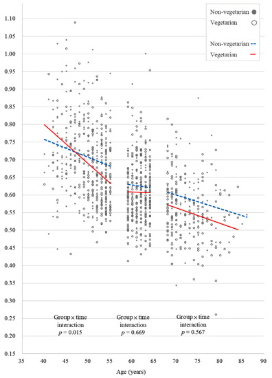 Figure 1 and Figure 2 show the scatter plots of the lumbar spine and left femoral neck BMD, respectively, of vegetarian and non-vegetarian women in the three age groups. Only the plots for the lumbar spine and left femoral neck BMD were constructed because the interactions between time and diet in other BMD sites and TBS were not statistically significant. In women 40–55 years, a vegetarian diet was significantly associated with a greater decrease over time in both lumbar spine BMD (p < 0.001) and left hip femoral neck BMD (p = 0.015) (Figure 2). However, for those 56–64 years and 65–90 years, a vegetarian diet was not significantly associated with changes in any of the BMD sites over time. In addition, a vegetarian diet was not significantly associated with changes in TBS over time in any of the three age groups.