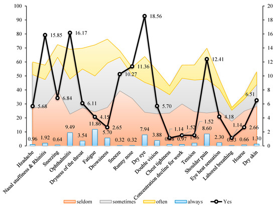 Figure 2 shows the self-diagnosis experience and pseudo-diagnosis rates for participants’ subjective symptoms. During working hours, workers frequently reported fatigue (22.12%) and ophthalmitis (21.20%) and occasionally reported headache (23.72%), sneeze (24.04%), ophthalmitis (25.00%), fatigue (25.64%), dryness of the throat (27.65%), and drowsiness (31.65%). The doctors’ diagnoses of these subjective symptoms were dry eye (18.56%), ophthalmitis (16.17%), and nasal stuffiness and rhinitis (15.85%).