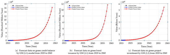 The forecast of China’s green credit balance, green bond issuance scale and green project investment from 2020 to 2060 can be predicted in the same way. The forecast results are as follows: green credit balance, green bond issuance scale and green project investment increase year by year in the next 40 years, as shown in Figure 1. However, it can also be seen from Figure 2 that in the next 5–10 years, the development rate of green credit balance, green bonds and green investment will be very slow, which is not conducive to accelerating the development process of green finance. Therefore, the development of green finance should not only be limited to developing traditional financial products, but also carrying out product innovation and developing a variety of green financial products.