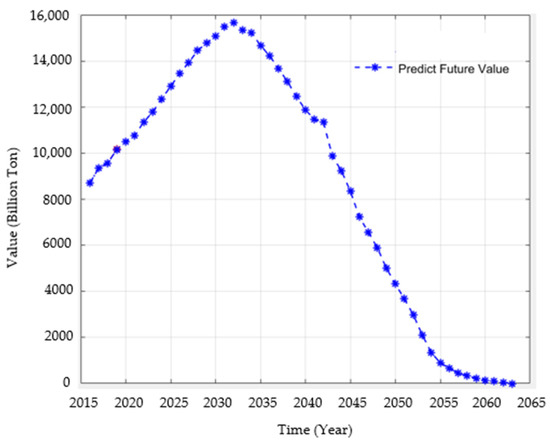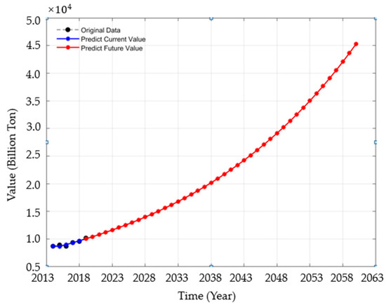 Through the grey prediction model, the predicted data on CO2 emissions in China from 2020 to 2060 are shown in Figure 2. The blue part is the comparison between the actual value and the predicted value of CO2 emissions from 2014 to 2019, which almost coincide, indicating that the forecast meets relatively high requirements, and it is well fitted. However, due to the grey prediction model performing trend changes weakly and it usually only presents a single growth or decline trend, so it is necessary to improve the prediction of CO2 emissions further.