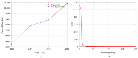 Prediction results of BP neural network (multi-layer) model. (a) The prediction of data on CO2 emissions in the past. (b) The learning and training process of this model.