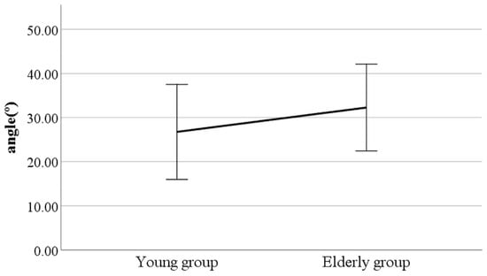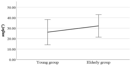 As a result, we found significant differences in lateral flexion of the spinal column at the double support phase, head movements in the sagittal plane at the heel-strike, head movements in the sagittal plane at the toe-off, and mean head movements in the sagittal plane (see Figure 2, Figure 3, Figure 4 and Figure 5). Furthermore, the parameters of lateral flexion of the spinal column at the double support phase, head movements in the sagittal plane at the heel-strike, head movements in the sagittal plane at the toe-off, and mean head movements in the sagittal plane were higher in the elderly group than in the young group. Meanwhile, no significant differences were found in left knee varus/valgus, right knee varus/valgus, foot varus/valgus, toe-in gait/toe-out gait, or pelvis abduction/adduction.