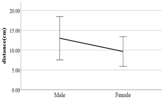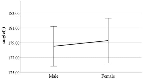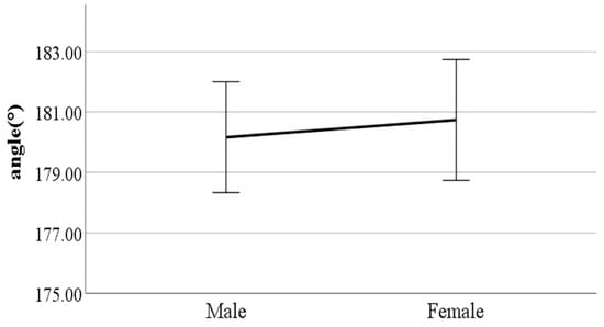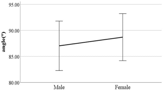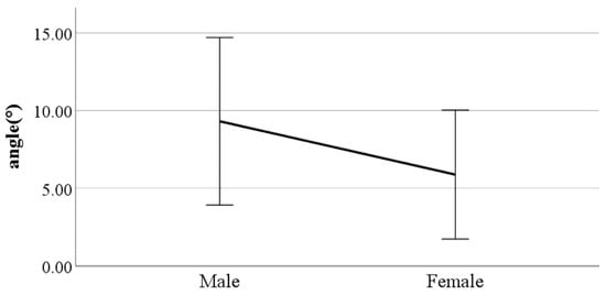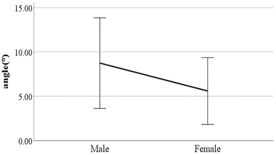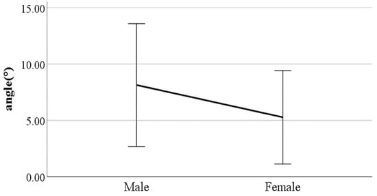 Overall, men walk with their upper bodies bent forward more than women. The results of this study show that men’s flexion of the spinal column in the sagittal plane when walking is higher than that in women. In addition, the results indicating that men have larger forward/backward bending values than women also show that the walking characteristics of men are distinct from those of women. The forward/backward trunk bending at toe-off does not show significant gender differences at the 0.05 levels in the t-test results. However, the average value for males is smaller than that for females, which can be interpreted to contribute to the same result as above. These walking properties, in which men bend their upper bodies further forward, are consistent with existing research results: According to Li et al., men’s cervical vertebrae are forward bent compared to women when walking [26]. In addition, Chung et al. confirmed that the male torso is tilted more forward than the female torso when walking [27].
