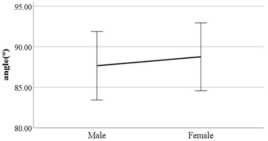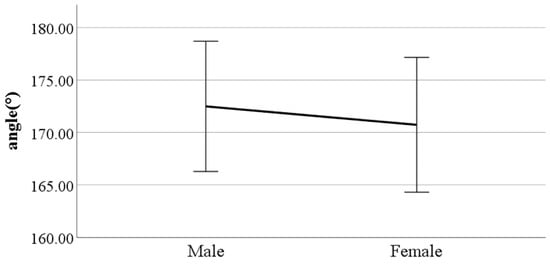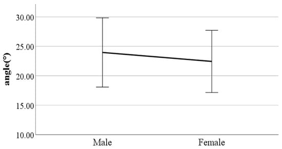According to the results, men generally have a greater knee angle when grounding compared to women. The greater the knee angle, the stronger the knee stretches. Therefore, men tend to walk with their knees straighter than women. This trend is consistent with existing studies showing that male knee extension is on average greater than that of females when grounding [25]. In addition, on ground grounding (heel-strike), the foot angle is generally greater than that of women. In other words, men have a greater degree of dorsiflexion at the point where the heel touches the ground than women. In general, ankle joint flexion of females is significantly smaller than that of males at the point of the ground during the walking cycle [22]. This is consistent with the results of this study, which show that the angle of feet of males on grounding is generally greater than that of females, as a larger flexion of the ankle joint corresponds to a greater angle of feet.