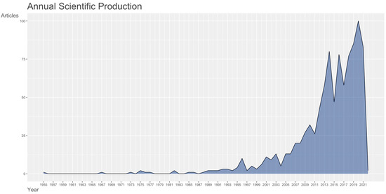 We included a total of 908 journal articles spanning from 1955 to 2021, obtained from 385 source documents. The average annual growth rate for publications regarding preterm birth and environmental toxicants is estimated at 1.63%, and the trend is shown in Figure 1.
