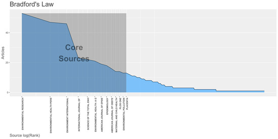 The top journals with the highest number of published research were Environmental Research (n = 53 articles, total citations (TC) = 1289 h-index = 21, impact factor (IF) = 6.498), followed by Environmental Health Perspectives (n = 47, TC = 4662, h-index = 35, IF = 9.031), and then Environment International (n = 46, TC = 1215, h-index = 20, IF = 9.621). The top 10 journals also comprise core sources among 369 journals publishing about the topic as shown in Figure 2, along with PLoS ONE, Environmental Pollution, and Placenta. Among the top 10 journals, six of these are relevant to environmental themes, two emphasize epidemiological relevance (American Journal of Epidemiology, Epidemiology), while two cater to obstetrics, gynecology, and child health (American Journal of Obstetrics and Gynecology, Maternal and Child Health). The results are summarized in Table 2.