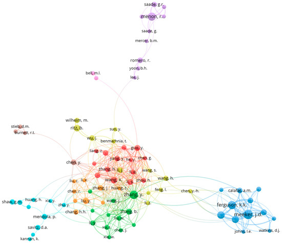 The top authors who have published the highest number of papers were John Meeker of the School of Public Health, University of Michigan (n = 27, fractional authorship (FA) = 2.328, h-index = 18, TC = 321), Ramkumar Menon of the University of Texas Medical Branch (n = 21, FA = 3.94, h-index = 12, TC = 560 ), and Kelly Ferguson of the US National Institute of Environmental Health Sciences (NIEHS) (n = 20, FA = 3.26, h-index = 16, TC = 1097). Data are shown in Table 3. Only around 1.98% of all authors have published at least four papers, with 81.4% of all authors only publishing a single paper. Co-authorship network visualization reveals multiple clusters of co-authorship with major clustering around authors from China, as seen in Figure 3.