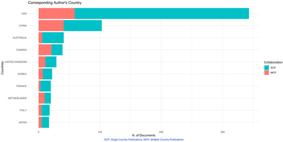 The top countries that have published the highest number of papers include the USA (n = 343, single country publications (SCP) = 284, multiple countries publication (MCP) = 59, MCP ratio = 0.1720, TC = 13798), China (n = 103, SCP = 62, MCP = 42, MCP ratio = 0.398, TC = 1848), and Australia (n = 41, SCP = 35, MCP = 216 MCP ratio = 0.0.1463, TC = 923). Results are shown in Table 5 and Figure 4.