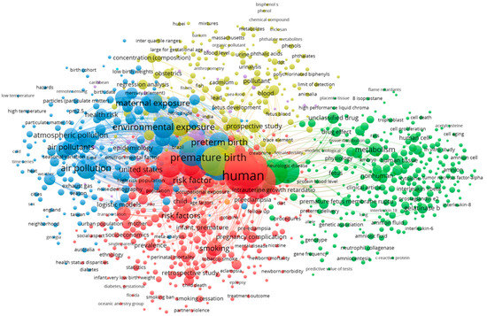 Co-occurrence analysis was also undertaken, as shown in Figure 6. Overall, four clusters of keywords were observed. These were designated as relating to human studies (red), air and particulate matter pollution (blue), environmental pollutants (yellow), and molecular studies on non-human and tissue/cellular samples (green).