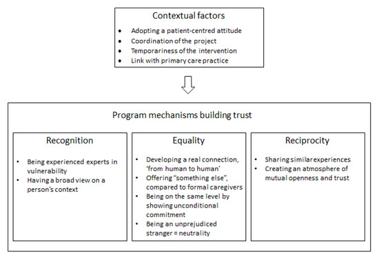 The present study aimed to provide insight into the meaning of trustful relationships between CHWs and vulnerable citizens and to understand how and under which circumstances these CHWs are likely to gain trust in their communities. A realist method of evaluation was undertaken in order to answer the following questions: (1) Which mechanisms enable CHWs to gain trust in a vulnerable patient community and to establish psychosocial health outcomes, and which context factors influence this trust-building between CHWs and vulnerable citizens? (2) What makes the CHW approach complementary to the interaction with formal caregivers in primary healthcare settings? The conceptual framework by Gilson et al. [27] is used as a theoretical framework to guide the analysis. Our purpose is to understand how interpersonal trust between CHWs and vulnerable citizens plays out in the workplace of PCP in Ghent during the COVID-19 pandemic, and from this make recommendations on the building of trustful relationships with community members in other high-income country (HIC) primary care settings.